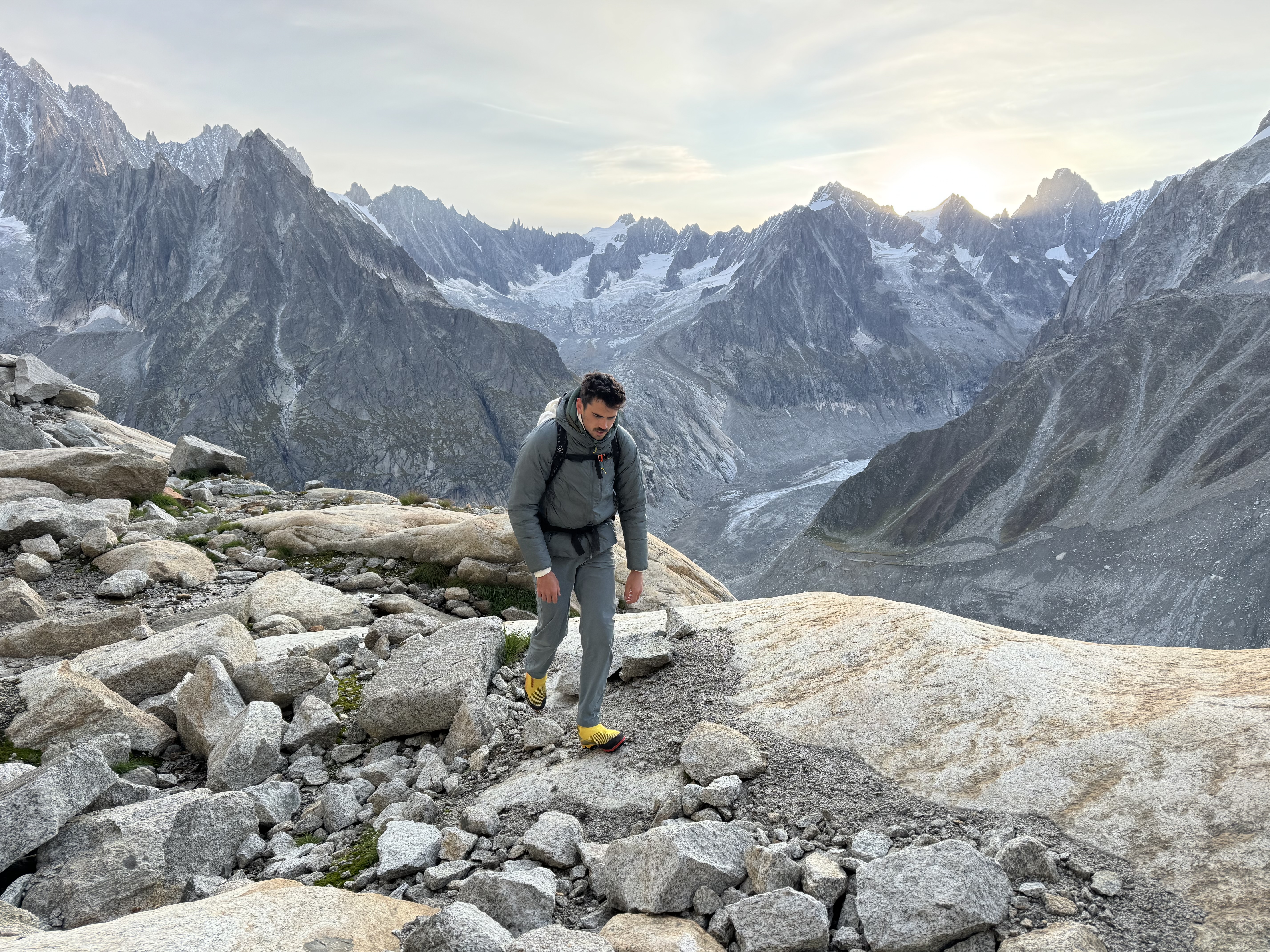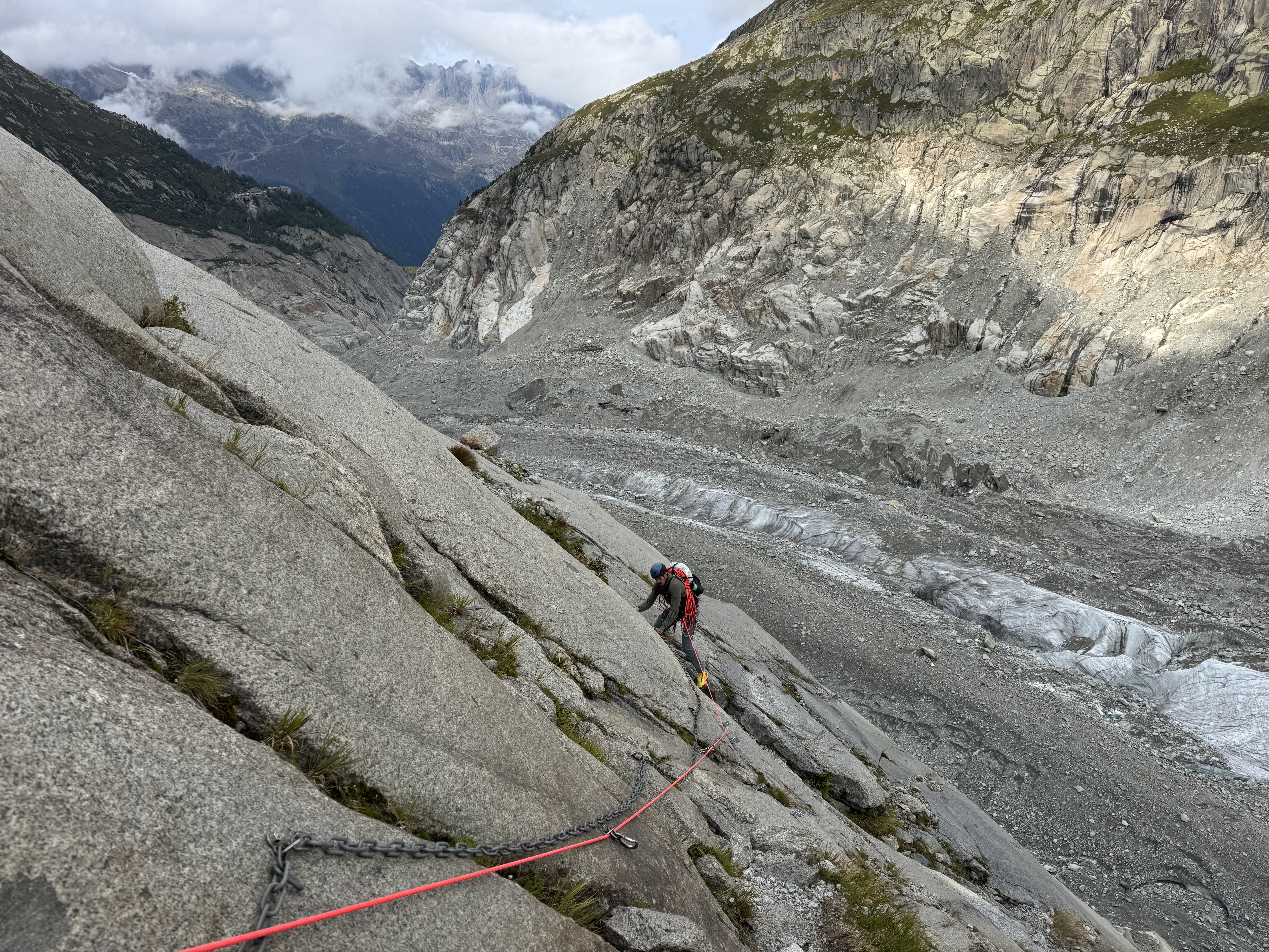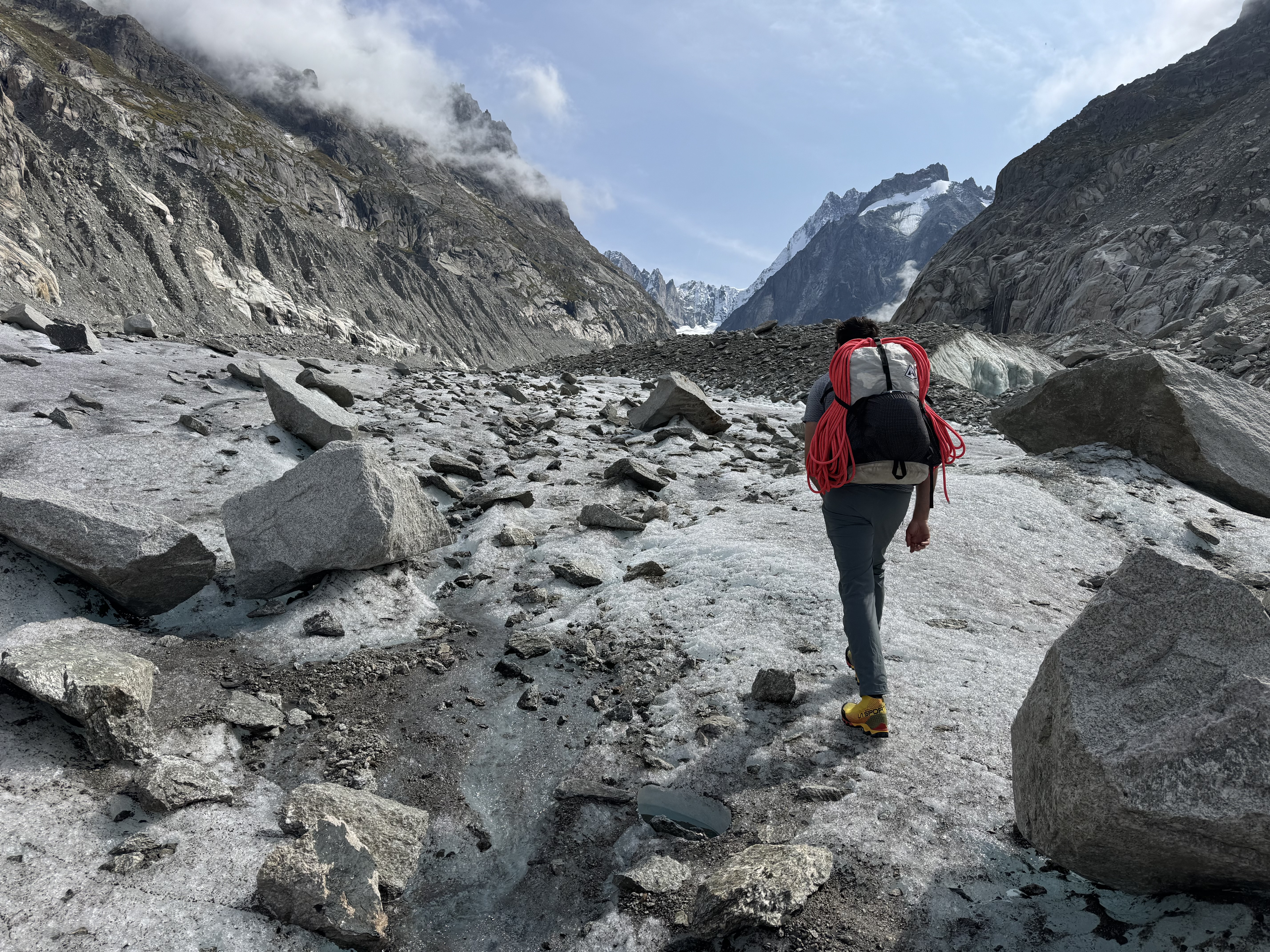 We headed to cooler temps in Chamonix and were immediately rewarded with stunning views from the Mer du Glace glacier. Leaving the house with all our gear, then taking the bus, to the train, to the gondola, to the glacier, to the via ferrata, to the Envers hut left me reeling over European alpinism all over again. I don't know if they do it right but they do it different — and whatever else it is it's very rad.Car to plane to bus to train...