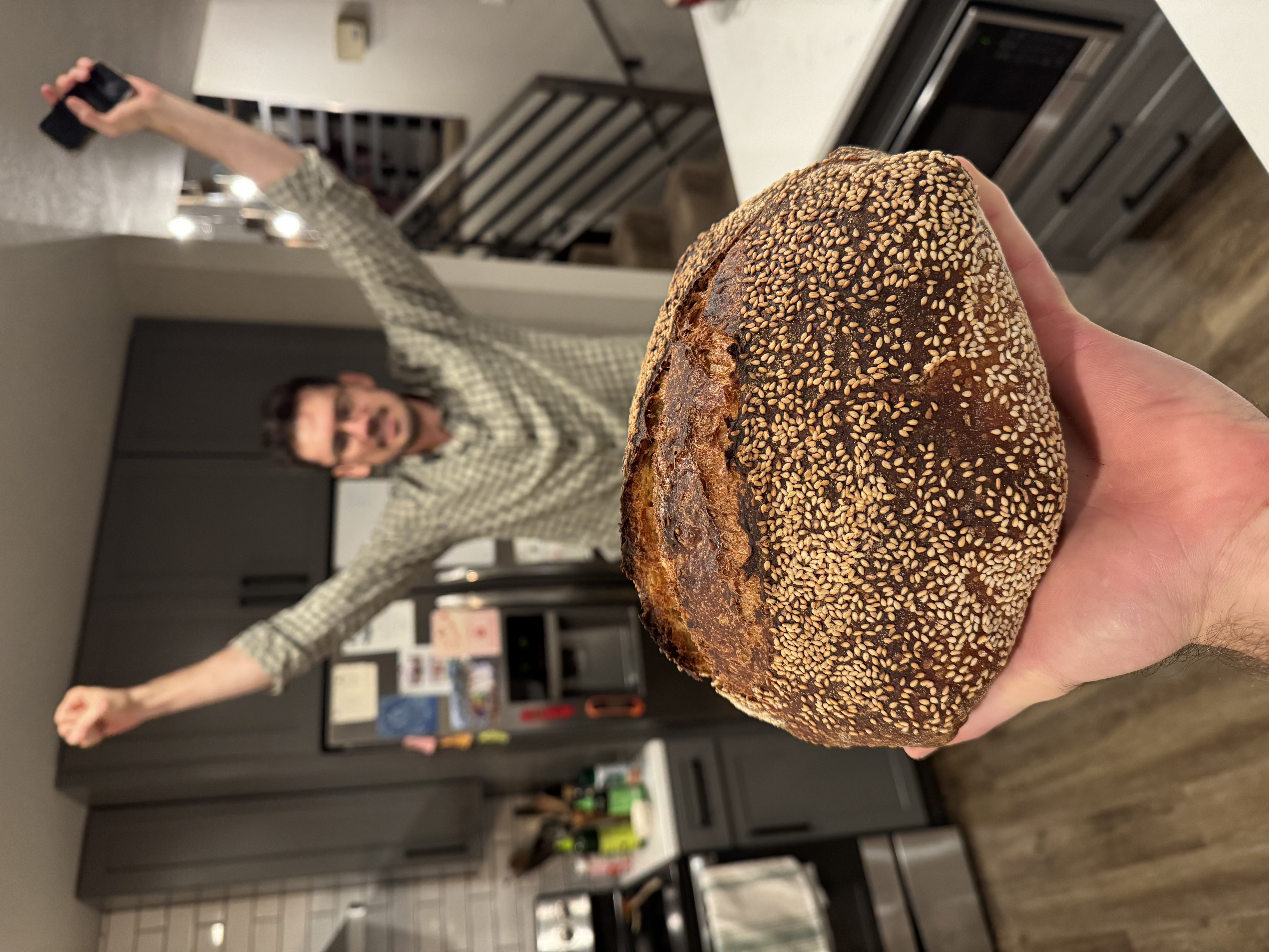 - After you shape this loaf, gently move it to a wet surface (seam side up), then to a surface covered in sesame seeds in order to get a nice sesame seed crust. Then proceed as normal.